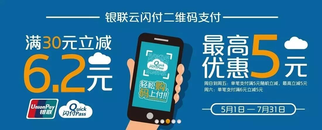 2017年5月27日,银联联合40余家商业银行在京共同宣布,正式推出银联云闪付二维码产品,持卡人通过银行APP可实现银联云闪付扫码支付。6月2日起,在全国40个知名商圈约十万家商户,使用银联云闪付挥卡、手机以及扫码支付,均可享受62折优惠回馈。