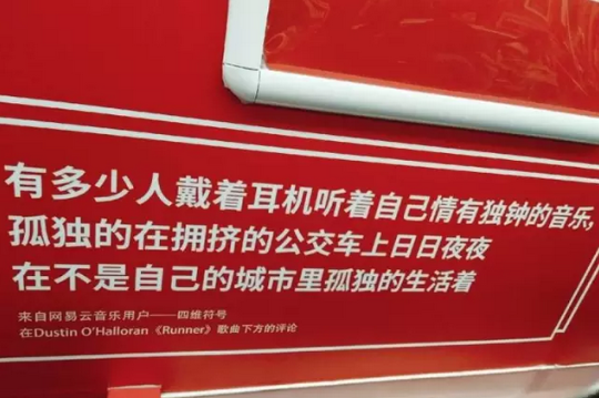 今年3月,网易云乐评地铁专列一度刷爆朋友圈,网易云音乐把一度深深打动我们的那些歌曲评论,印满了杭州地铁1号线和整个江陵路地铁站。它们来自网易云音乐点赞数最高的5000条优质乐评之中,经过层层筛选,最终映入乘客眼帘,用音乐故事填满1号线之旅。