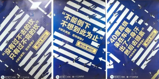 钉钉最近在地铁投放的广告,钉钉用一些艰苦创业的故事致敬创业者们,文案很丧,又暗戳戳地刺痛了每一位创业者的心,既然创业这么苦,为什么还要坚持呢?