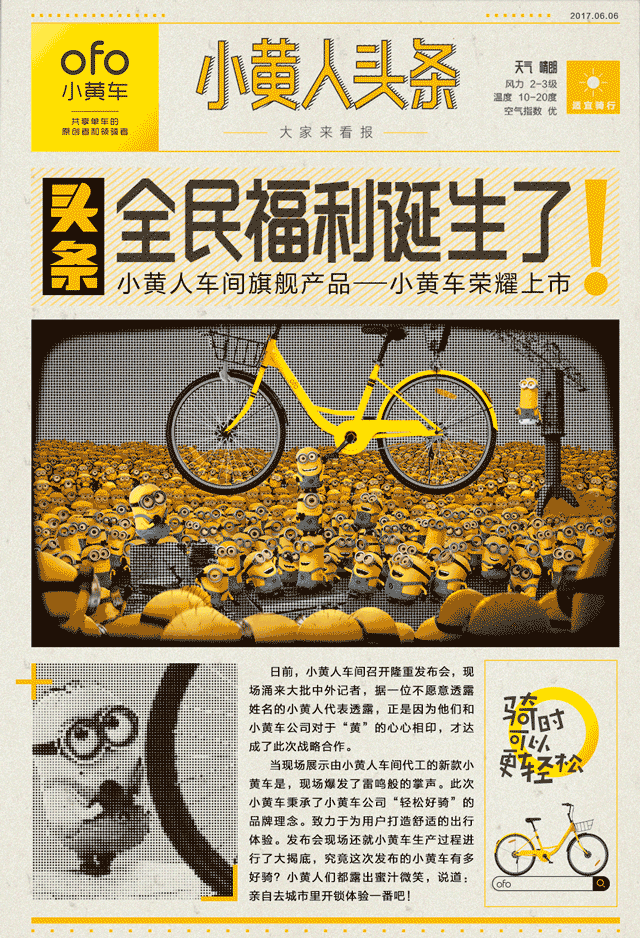 05ofo:小黄人研发车间 时间:6月30日 品牌主:ofox小黄人 代理商:上海意类 《神偷奶爸3》上映前夕,美国环球影业与当下最火的共享单车小黄车ofo合作推出了新款“大眼小黄车”,车头两只圆圆的大眼睛十分醒目,车轮上装饰着小黄人的可爱图案,小黄人版“大眼车”一经推出迅速占领街头,引起热议。 ofo小黄车与小黄人的合作,不仅实现了产品的炫酷迭代,提升了用户的情感体验,还带动两大粉丝群体的深度互动,增加了品牌的亲近感和用户黏性。ofo小黄车一举多得的跨界营销模式,又一次刷新了用户对共享单车的认知和期望值,也为共享单车行业提供了值得借鉴的跨界合作营销经验。 06《人民日报》x 天天P图:晒出我的军装照 时间:7月29日(首次发布) 品牌主:《人民日报》客户端 代理商:《人民日报》新媒体中心、采访部、H5技术制作团队,腾讯天天P图 这个活动,想必绝大多数的人都参与过,2017年8月1日是中国建军90周年。建军节前后,每个人的朋友圈是不是都被一大波“军装照”强势刷屏了!大家纷纷晒出属于自己的军装照,朋友圈里的小伙伴一个个瞬间变得英姿飒爽起来,满朋友圈的革命队友就这么出现了。